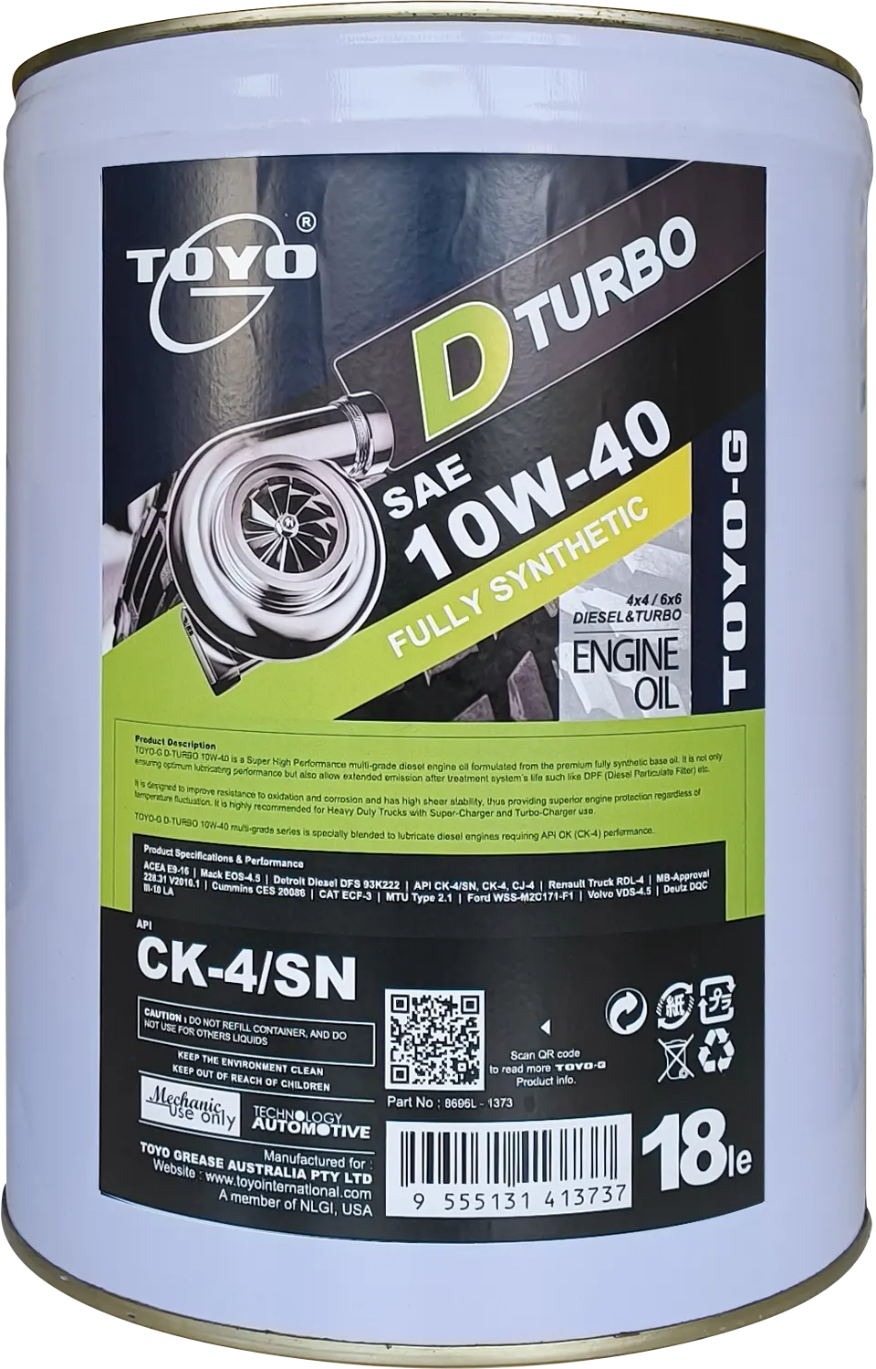 TOYO-G D-TURBO 10W-40 - это суперэффективное всесезонное масло для дизельных двигателей, разработанное на основе полностью синтетического базового масла премиум-класса. Обеспечивает оптимальную смазывающую способность, позволяет продлить срок службы системы очистки выхлопных газов, такой как DPF (дизельный сажевый фильтр) и т.д. Разработано для повышения стойкости к окислению и коррозии и обладает высокой устойчивостью к сдвигу, обеспечивая тем самым превосходную защиту двигателя независимо от колебаний температуры. Настоятельно рекомендуется для большегрузных грузовиков с нагнетателем и турбонаддувом. Всесезонная серия TOYO-G D-TURBO 10W-40 специально разработана для смазки дизельных двигателей, требующих характеристик API CK (CK-4).